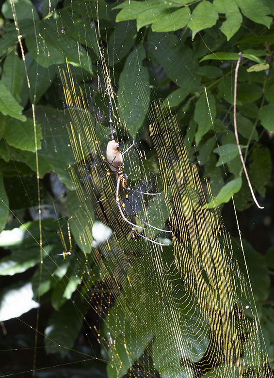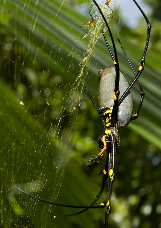 Particularly attractive to the visual sensitivities of insects, the bright-yellow ventral features of the Giant Golden Orb-weaving Spider attract flying insects and ensnare them in the enormity of their less-conspicuous golden orb-webs. Small birds also fall victim to the visual allure of these dazzling yellow temptations.