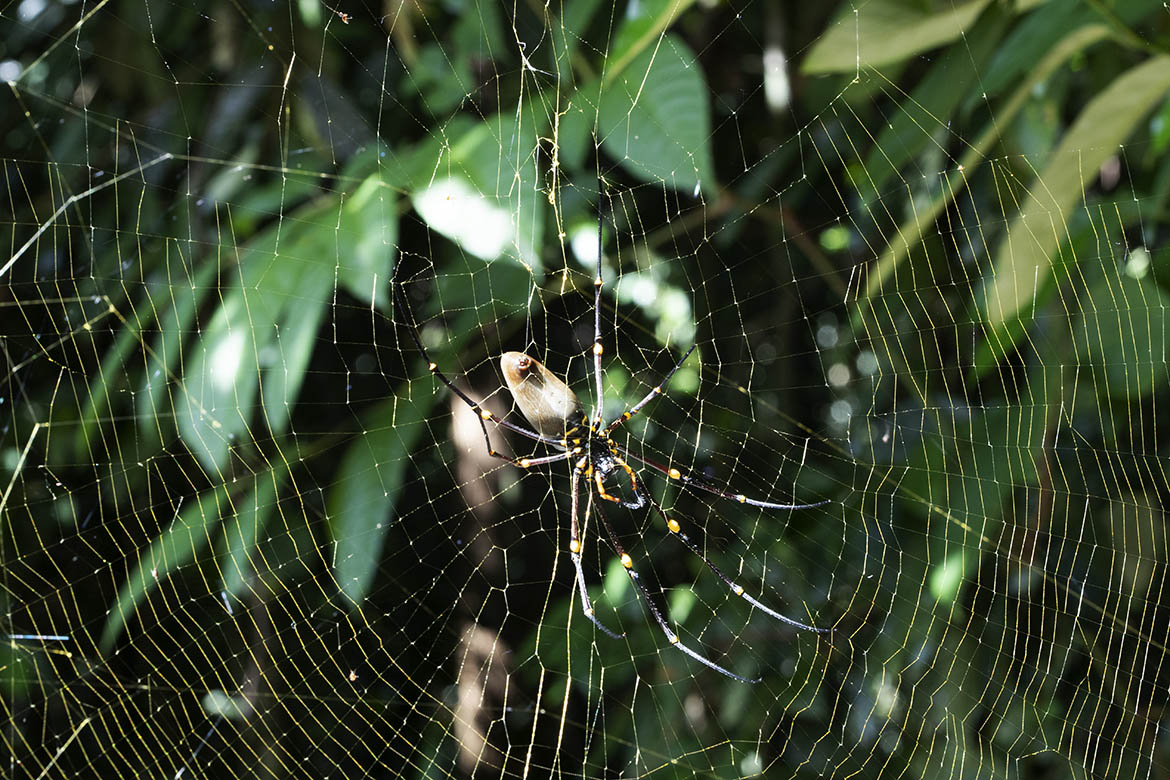 A scintillating sheen of gold punctuated the clear May light between our kitchen verandah and the rainforest wall some 3-metres distant. The expanse was occupied with the enormity of a Giant Golden Orb-weaving Spider’s web. Many spiders greatly expand their sensory reach through variable expressions of web construction and maintenance, with the most expansive reach going to Giant Golden Orb-weaving Spider – Nephila pilipes . With female gigantism correlating with their proximity to the equator, the spectacularly large and strong orb-webs report the precise location of colliding prey, making neotropical Nephila the world’s dominant group of bat-catching spiders. Holding the web under tension provides crucial information about nearby opportunities and threats, especially in darkness. Where many other spiders dismantle their webs at the end of night to hide from birds throughout the day, then re-construct with ensuing darkness, N. pilipes always remains positioned at the centre of its enormous web. Only cassowaries, and in all probability, Papuan Frogmouths, have a big enough gape to swallow giant orb-weavers off their webs.