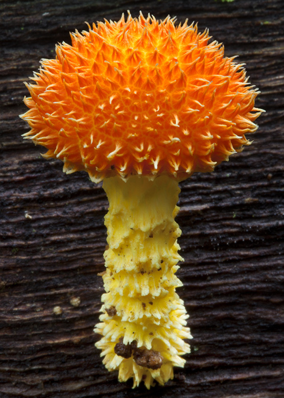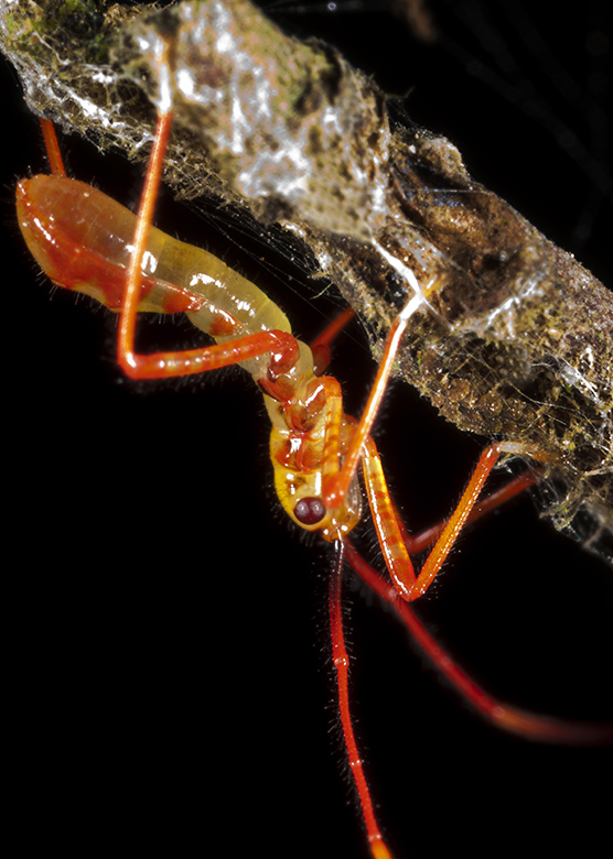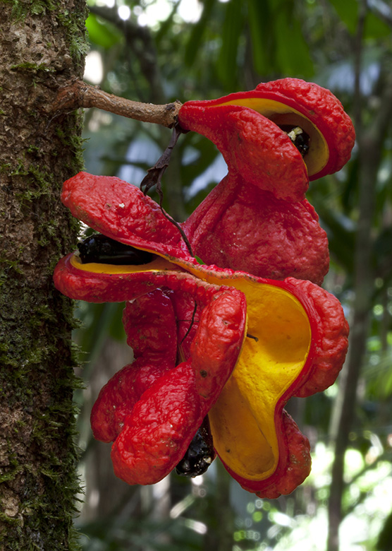 Red and yellow combine to optimise conspicuousness in the light environment of the rainforest interior. The Golden-scruffy Collybia – Cyptotrama asprata (Berk.) Redhead & Ginns (1980), glows as a smouldering ember against the earthy tones of a fallen tree-trunk, whilst the early instar-nymph of an undescribed Assassin Bug, contradicts its diminutive size with flare of brazen intensity. Broadcasting off the side of its tree-trunk to the enthusiasms of potential vectors, the red-hot spiralling of the Scarlet Bean – Archidendron ramiflorum (F.Muell.) Kostermans, A.G.J.H. (1956) opens to reveal glossy black seeds within a bed of blistering yellow.