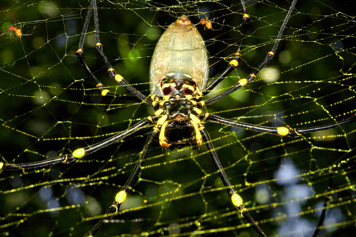 The bright-yellow ventral features of the Giant Golden Orb-weaving Spider – Nephila pilipes (Fabricius, 1793) are particularly attractive to the visual sensitivities of flying insects, ensnaring them in the enormity of their golden orb-webs. Small birds also fall victim to the visual allure of these dazzling yellow temptations.
