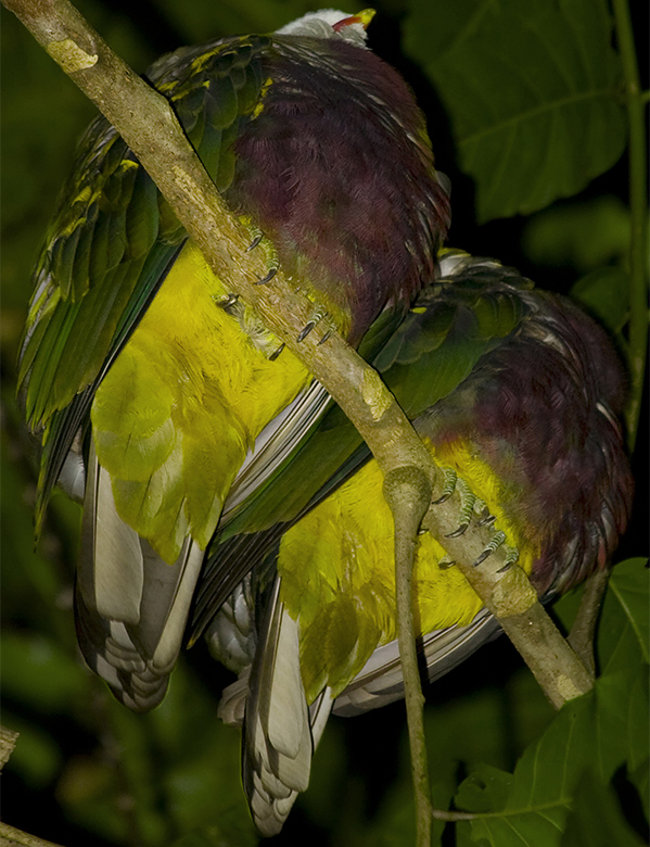 Yellow highlights and enormous compound-eyes expose the world’s largest dragonfly, the Giant Petaltail – Petalura intengissima (Tillyard, 1908), found roosting off the tip of an isolated leaf. A little distance away, a pair of Wompoo Fruit Doves –Ptilinopus magnificus (Temminck, 1821) is brought to light by the vibrancy of their twin yellow posteriors, beautifully complementing the greens and purples of their greater proportions.