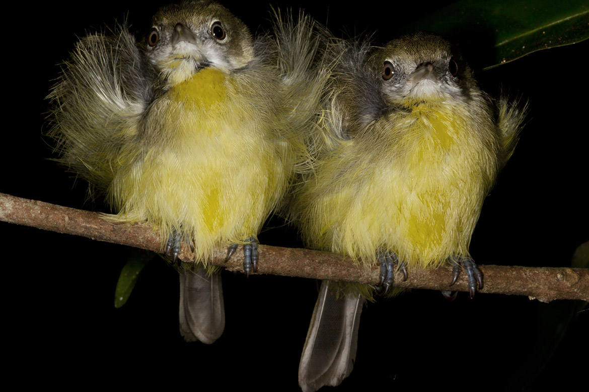 An uncharacteristic nocturnal foray is captured in torchlight, revealing a mobile strand of yellow, underpinning the graceful movements of an arboreal Common Tree Snake – Dendrelaphis punctulatus (Gray, 1826). Nearby, twin yellow breasts of fledgling Lemon-bellied Flycatchers – Microeca flavigastor (Gould, 1843) are illuminated, delighting their discoverer with their allied loveliness, but equally impressing with their roost-selection on the distal end of an understory branch that ensures any predatory advance of tree-climbing reptiles will give ample forewarning through vibration.